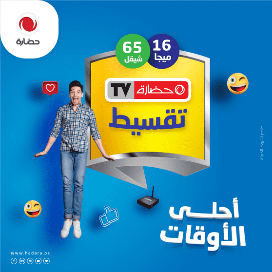 أطلقت شركة حضارة للاستثمار التكنولوجي وهي احدى شركات مجموعة الإتصالات الفلسطينية اليوم حملة جديدة تحت اسم "أحلى الاوقات"، استهدفت بها المشتركين الحاليين والجدد في الضفة الغربية، حيث تقدم للمشترك جهاز "حضارة TV بالتقسيط" بالإضافة الى عرض مميز على سعر الإشتراك الشهري على باقات حضارة TV.