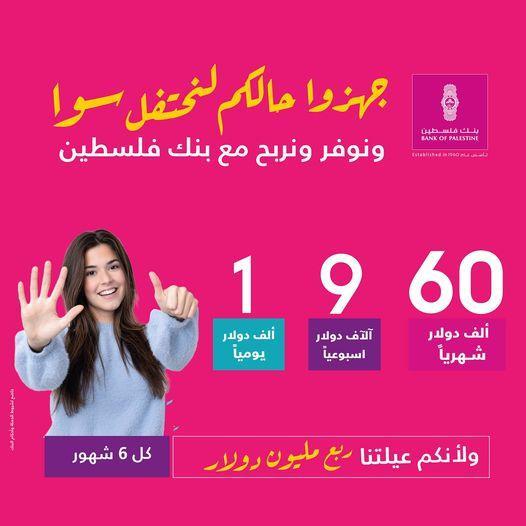 بمناسبة احتفالات البنك بمرور 60 عاماً على تأسيسه، وانسجاماً مع سعيه الدائم للتميز بمكافأة عملائه بأرقى السبل وبأفضل الجوائز، وتعزيزاً لرضاهم لما يقدمه البنك من خدمات تسهل حياتهم وتلبي احتياجاتهم. أعلن بنك فلسطين عن إطلاقه أكبر حملة على برنامج حسابات التوفير في فلسطين بجوائز يومية وأسبوعية وشهرية وجوائز كبرى عددها اثنتين بقيمة ربع مليون دولار لكل منها.