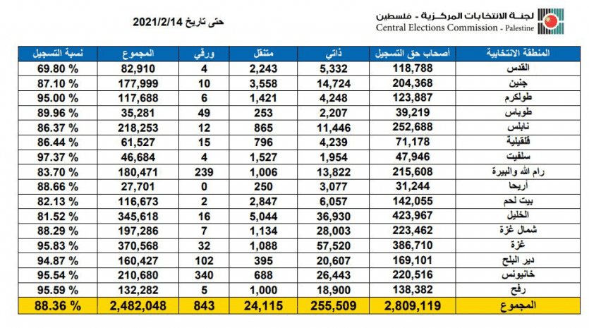 أعلنت لجنة الانتخابات المركزية، أن عدد المسجلين للانتخابات الفلسطينية 2021، بلغ 2.48 مليون مواطن ومواطنة حتى صباح اليوم الأحد، يشكلون ما نسبته 88.3% من أصحاب حق التسجيل؛ وفق إحصائيات جهاز الإحصاء المركزي.