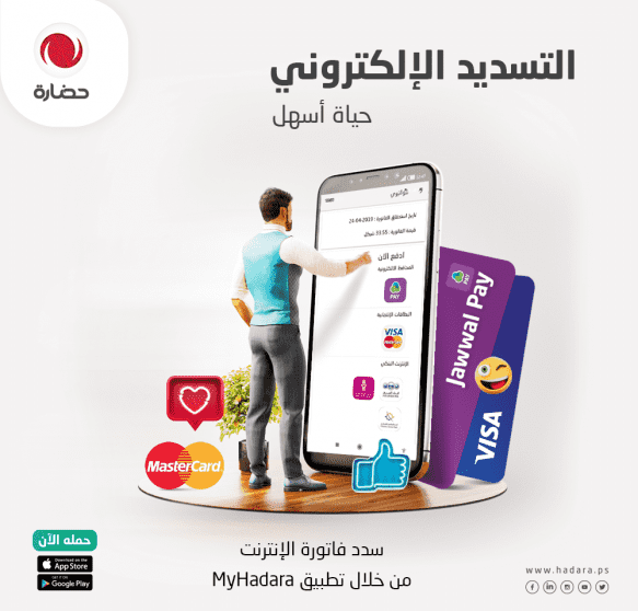 أعلنت شركة "حضارة" للاستثمار التكنولوجي وهي إحدى شركات مجموعة الاتصالات الفلسطينية عن إطلاقها خدمة"التسديد الإلكتروني" عبر تطبيق "MyHadara"، حيث تتيح لمشتركي شركة حضارة الاطلاع على تفاصيل فواتيرهم الصادرة والخاصة بخدمة الإنترنت والخدمات الأخرى وإمكانية تسديدهامن خلال قنوات التسديد الإلكتروني ( محفظة Jawwal pay ، بطاقات الإئتمان الفيزا كارد والماستر كارد، و الإنترنت البنكي) .