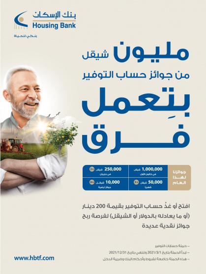 انطلاقا من سياسة البنك الهادفة لتعزيز ثقافة الادخار لدى عملائه ومكافأتهم على ولائهم وثقتهم، أطلق بنك الإسكان حملته الترويجية الخاصة بحسابات التوفير للعام 2021، وتبلغ قيمة الجائزة الكبرى مليون شيقل تقدم في نهاية العام، وذلك سعيا من البنك لتشجيع المواطن الفلسطيني بشكل عام وعملاء البنك بشكل خاص على التوفير والادخار، ومن جانب آخر منح المدخرين لدى البنك من كافة القطاعات وجميع الأعمار فرصاً كبيرة للفوز بجوائز عديدة وبقيم كبيرة.
