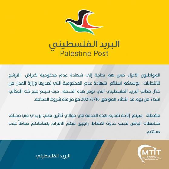 وأعلنت الوزارة أن بوسع هؤلاء المواطنين استلام شهادة عدم المحكومية التي تصدرها وزارة العدل من خلال مكاتب البريد الفلسطيني التي توفر هذه الخدمة، حيث سيتم فتح تلك المكاتب ابتداءً من يوم غد الثلاثاء الموافق 2021/3/16 مع مراعاة شروط السلامة.