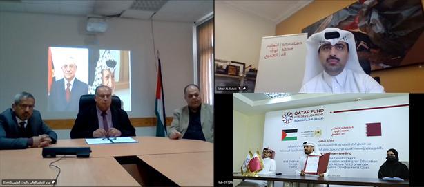 ووقع المذكرة التي أقيم حفلها عبر تقنية الاتصال المرئي، وزير التعليم العالي والبحث العلمي محمود أبو مويس، والمدير العام لصندوق قطر للتنمية خليفة بن جاسم الكواري.