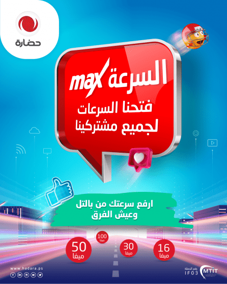 أعلنت شركة حضارة للاستثمار التكنولوجي وهي إحدى شركات مجموعة الاتصالات الفلسطينية اليوم عن رفع سرعات مشتركيها ضمن حملتها الجديدة " السرعة ماكـــس".