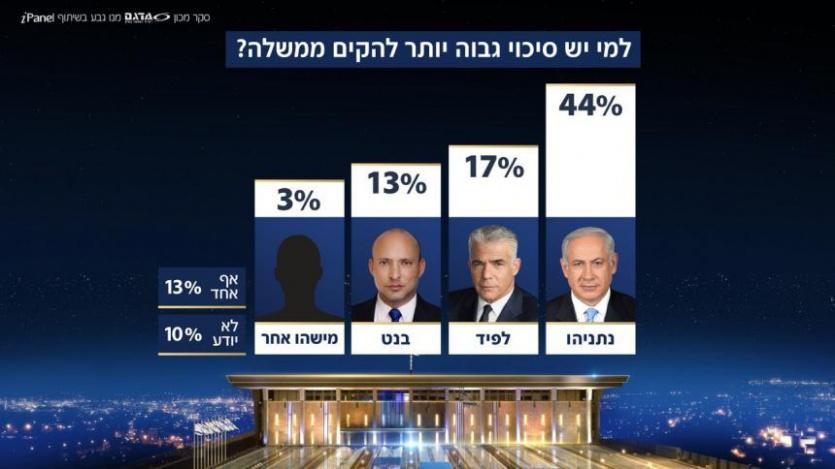 وبشأن سؤال حول من لديه فرصة أكبر لتشكيل حكومة في حال نجحت الخطوة، فإن بنيامين نتنياهو زعيم الليكود تحصل على إجابة 44 بالمئة، بينما 17 بالمئة أجابوا لصالح يائير لابيد زعيم حزب هناك مستقبل، و15 بالمئة لصالح نفتالي بينيت زعيم يمينا، و13 بالمئة لا أحد، و10 بالمئة لا يعرفون، و3 بالمئة لشخص آخر.