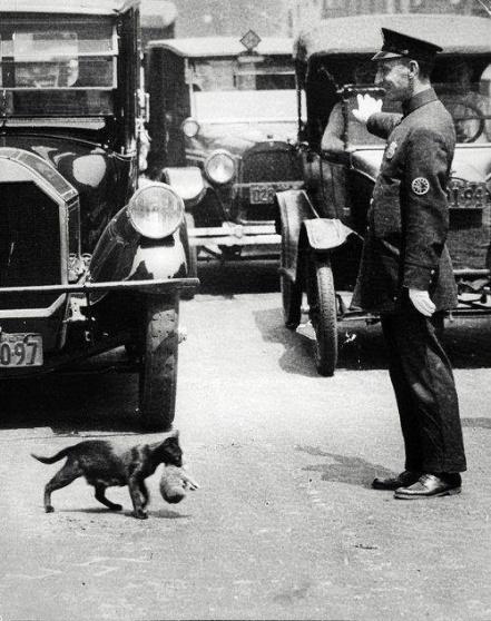 شرطي في نيويورك يوقف السير في الشارع المركزيCentre Street المزدحم بحركة المرور لكي تعبر قطة تنقل صغيرها ، وتعود الصورة لـ 29 تموز 1925، أما المصور ( هاري واميسك)