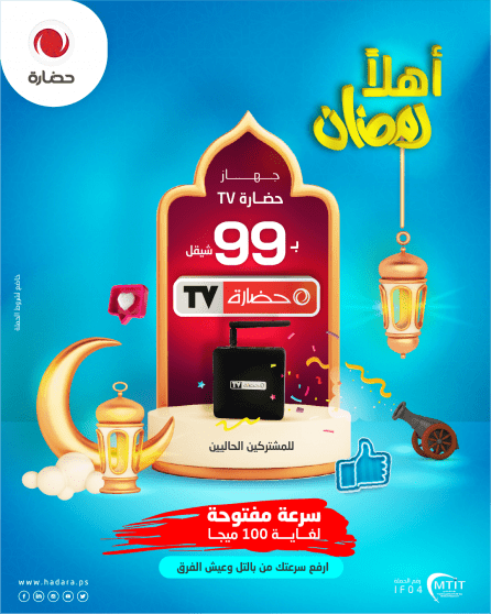 أطلقت شركة حضارة للاستثمار التكنولوجي وهي إحدى شركات مجموعة الاتصالات الفلسطينية حملتها الإعلانية بمناسبة شهر رمضان المبارك تحت شعار “ أهــلًا رمضــان “ استهلالًا بشهر الخير واللمات العائلية المميزة على جهاز حضارة TV.