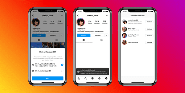 وكجزء من الإعلان، قالت "إنستغرام" أيضا إنها ستطرح أداة للسماح للأشخاص بحظر الحسابات الجديدة بشكل استباقي من المتحرشين. والآن، عندما يحظر أحد المستخدمين شخصا ما في التطبيق، سيكون لديه خيار حظر أي حسابات جديدة ينشئها هذا الشخص. ورفضت الشركة تحديد كيفية القيام بذلك، واكتفت بالقول إنها تستخدم "مجموعة متنوعة من الإشارات" لاكتشاف الحسابات الجديدة من هؤلاء المستخدمين أنفسهم. وسيتم طرح الميزة على مستوى العالم في الأسابيع القليلة المقبلة.