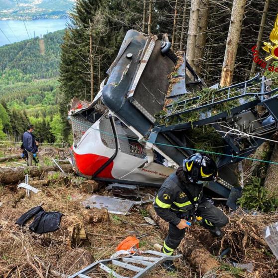 أظهرت صورة للحطام التقطتها فرقة إطفاء إيطالية بقايا عربة التلفريك المحطمة والمتداعية وسط قطعة سميكة من أشجار الصنوبر بالقرب من قمة موتاروني المطلة على بحيرة ماغوري.