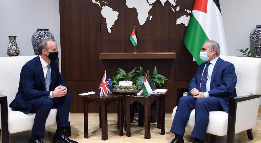 بحث رئيس الوزراء، محمد اشتية، مع وزير الخارجية البريطاني دومينيك راب، اليوم الأربعاء، في مكتبه برام الله، ملف إعادة إعمار قطاع غزة، وأهمية منع تكرار العدوان الإسرائيلي على القطاع من خلال مسار سياسي جدي، بحضور وزير الخارجية والمغتربين رياض المالكي.