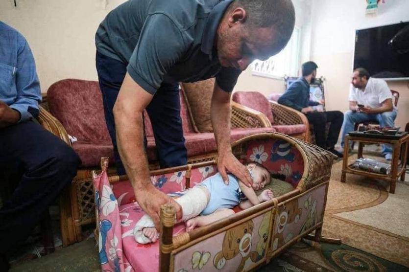 المواطن محمد الحديدي يعتني بطفله الناجي الوحيد بعد ان فقد زوجته وأطفاله الأربعة في مجزرة إسرائيلية جراء استهداف منزلهم بمخيم الشاطئ غرب مدينة غزة أثناء العدوان على القطاع والذي استمر 11 يوما، خلال شهر مايو 2021.