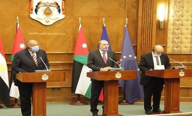 طالب بيان مشترك لوزارات خارجية مصر وفرنسا والأردن، اليوم الخميس، بوقف جميع الإجراءات الأحادية التي تقوض حل الدولتين، عقب اجتماع تنسيقي عقده وزراء خارجية الدول الثلاث عبر الاتصال المرئي، لاحقًا للقمة الثلاثية بين قادة الدول التي عقدت في 18 أيار الماضي.