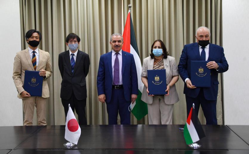 تحت رعاية وحضور رئيس الوزراء محمد اشتية وممثل اليابان لدى فلسطين ماسايوكي ماجوشي، وقع وزير المالية شكري بشارة ووزيرة الصحة مي الكيلة مع رئيس مكتب الوكالة اليابانية للتعاون الدولي "جايكا" في فلسطين توشيا آبي، منحة من الحكومة اليابانية بقيمة 8 مليون دولار لدعم جهود فلسطين في مواجهة كورونا، اليوم الأربعاء، في مكتب رئيس الوزراء برام الله.