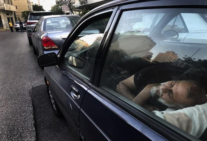 سائق لبناني ينام داخل سيارته في طابور طويل أمام محطة وقود في ظل تصاعد أزمة الوقود في البلاد