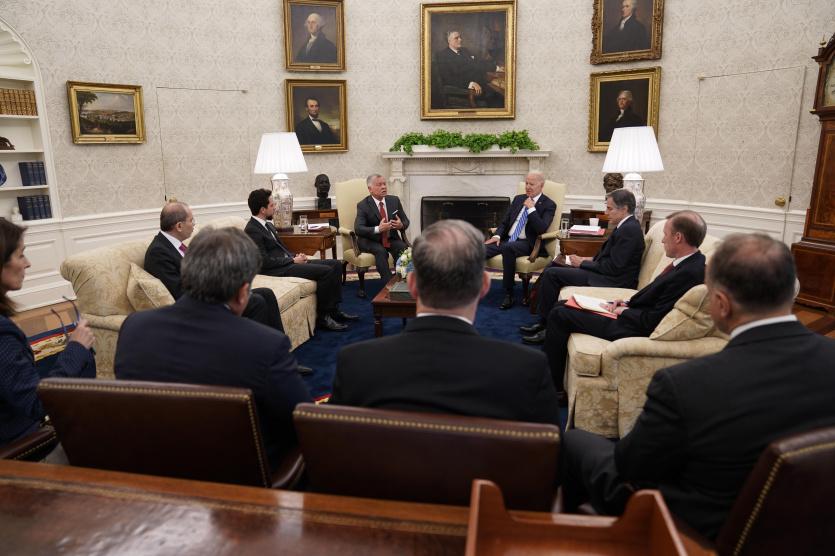 كما أكد ملك الأردن خلال لقاء قمة مع الرئيس الأميركي جو بايدن، في البيت الأبيض بواشنطن، والتي تصدرت أجندتها القضية الفلسطينية، وجوب العمل على إعادة إطلاق مفاوضات جادة وفاعلة بين الفلسطينيين والإسرائيليين، لتحقيق السلام العادل والشامل على أساس حل الدولتين.