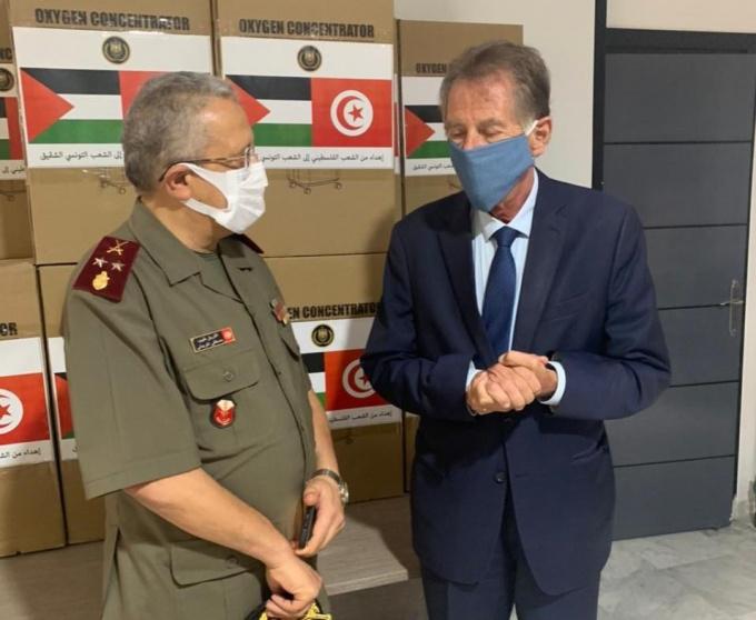 بتوجيهات من الرئيس محمود عباس، سلّم سفير دولة فلسطين لدى تونس هائل الفاهوم، اليوم الاثنين، 50 جهاز مكثِّف أكسجين لإدارة الصحة العسكرية بالمستشفى العسكري في تونس.
