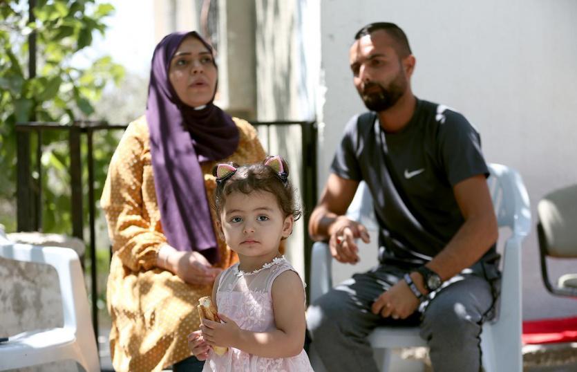 تمسك أنهار ابنتها جوليا (عام وستة أشهر) بكلتا يديها لتحتضنها وتقبلها، ثم تمرر أصابعها على شعرها لترتبه، بينما أحاط بها أقاربها والمهنئين بحريتها.