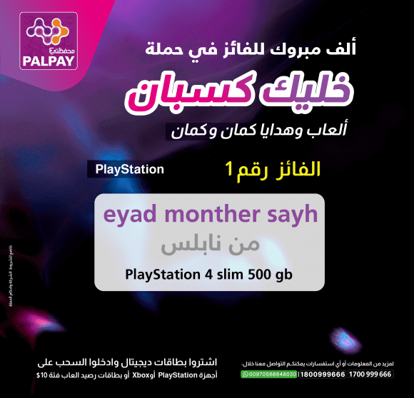 أعلنت شركة PalPay الرائدة في خدمات وحلول السداد الإلكتروني، عن الرابح الأول في السحب لحملة "خليك كسبان ألعاب وهدايا كمان وكمان" لشراء بطاقات الألعاب الرقمية (ديجيتال) عبر تطبيق "PalPay محفظتي"، وهو المواطن إياد منذر السائح من مدينة نابلس. وجرى تسليم الجائزة للفائز الأول في مقر الشركة برام الله، وهي عبارة عن جهاز (PlayStation 4 slim 500gb).