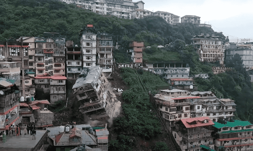 تداول رواد مواقع التواصل الاجتماعي فيديو لانهيار مبنى في منطقة شيملا بولاية هيماشال براديش، شمالي الهند.