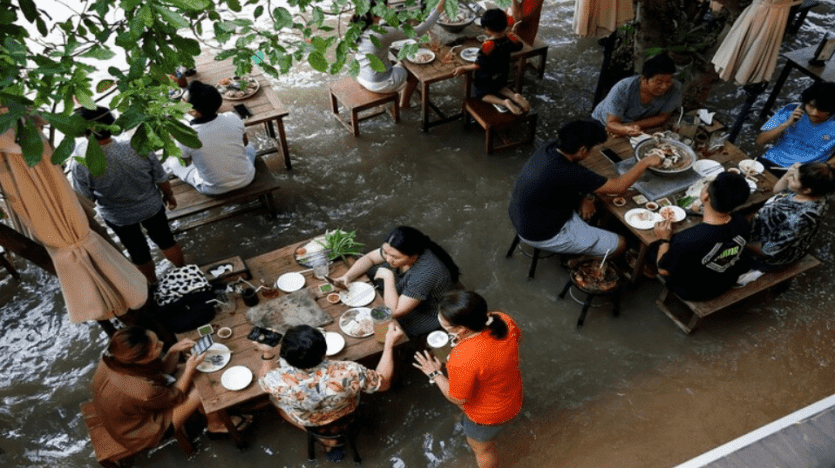 إلا أن المد المرتفع في النهر هذا الأسبوع أصبح على غير المتوقع نعمة لا نقمة، وبدلا من أن يغلق المطعم، ذاع صيته في البلاد إذ بقي مفتوحا أمام زبائن سرعان ما وزعوا صورهم وهم يستمتعون بتناول الطعام بينما أرجلهم في الماء، ويحاولون تحاشي الأمواج التي تدفعها القوارب تجاههم.