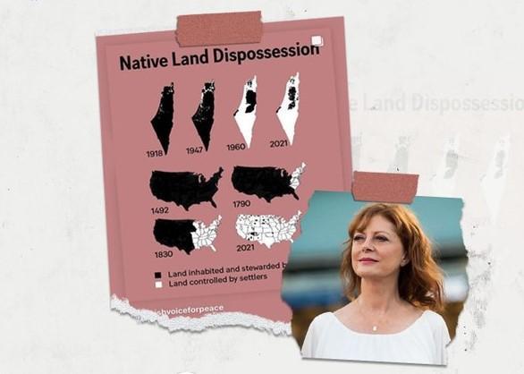 ونشرت ساراندون عبر حسابها على "تويتر"، بحسب ما نقلته "روسيا اليوم"، صورة تقارن مساحة الأرض التي استولى عليها مستوطنون في فلسطين بين عامي 1918 و2021، وأخرى في الولايات المتحدة انتزعت من سكانها الأصليين بين عامي 1492 و2021.