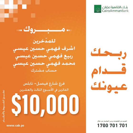 وتأتي حملة "ربحك قدام عيونك" ضمن سياسة والتزام البنك باستراتيجيته المستمرة في تقديم خدمات مصرفية وجوائز قيمة لعملائه، وتشجيعاً للمواطنين بفتح حسابات توفير في مختلف فروع بنك القاهرة عمان في فلسطين.
