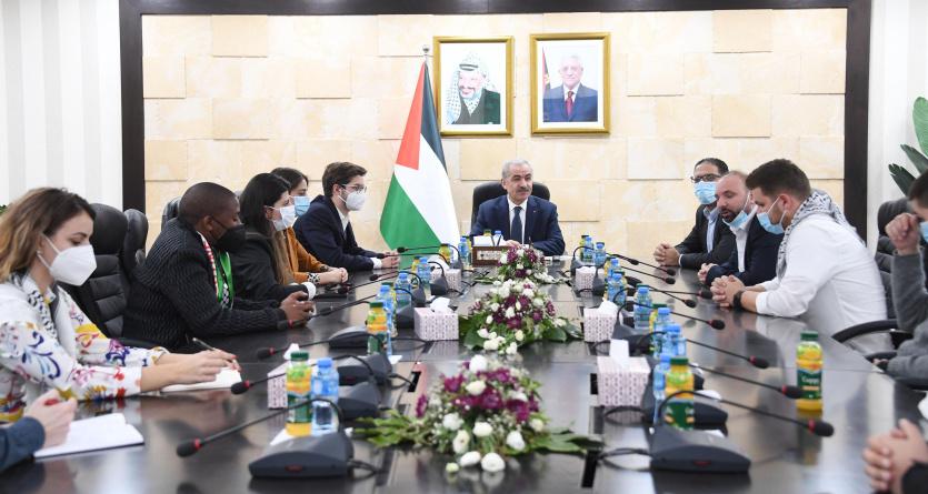 دعا رئيس الوزراء محمد اشتية، الاتحاد العالمي للشباب الاشتراكي للقيام بحملات لمناصرة القضية الفلسطينية وحقوق شعبنا المشروعة، كالضغط على دول العالم للاعتراف بدولة فلسطين، والتوجه لمقاطعة منتجات المستوطنات، غير الشرعية وفق القانون الدولي، والمساهمة في تجفيف المصادر المالية والداعمة لها.