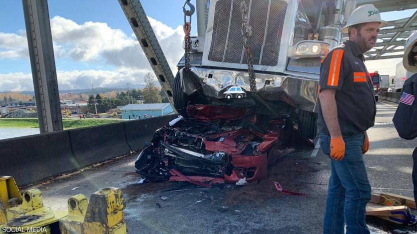 وتعرضت سيارة السيدة لاصطدام قوي من الخلف، وصعدت الشاحنة على المركبة، محطمة إياها بشدة، قبل أن ينجح فريق الإنقاذ بسحبها دون أن تخسر السيدة المحاصرة حياتها.