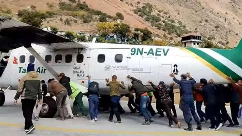 كشفت فيديو غريب من مطار في نيبال قيام أكثر من عشرة أشخاص يدفعون الطائرة بكل قوتهم من أجل إزاحتها عن مدرج هبوط الطائرات.
