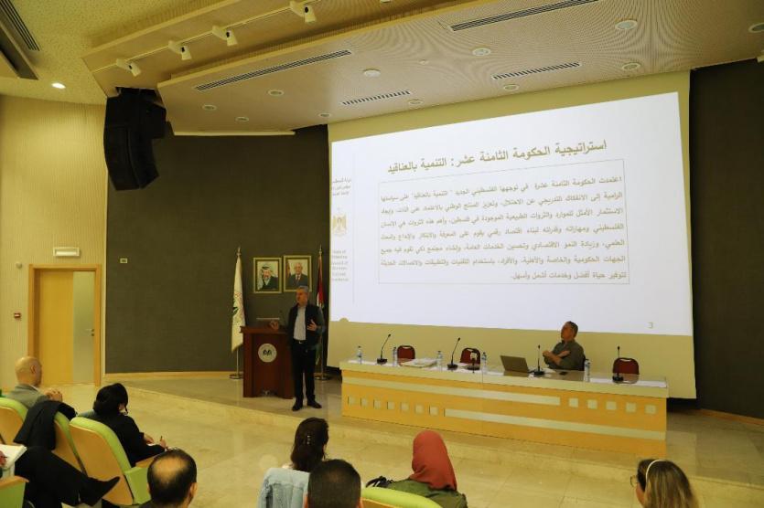 وقدم غانم عرضا حول عدة محاور رئيسية أبرزها استراتيجية الحكومة للتنمية بالعناقيد، وعنقود التكنولوجيا والإدارة العامة (فلسطين نحو الاقتصاد الرقمي)، الذي يهدف للاستغلال الأمثل لتكنولوجيا المعلومات بما يخدم الاقتصاد الرقمي الفلسطيني إلى أقصى درجة ممكنة، وربط ومواءمة وتنسيق الجهود الحكومية لتطوير القطاع التكنولوجي والإدارة العامة، وإعطاء الأولوية للمجالات التطويرية الضرورية وتحويلها لتدخلات كبرى وفق استراتيجية الحكومة.