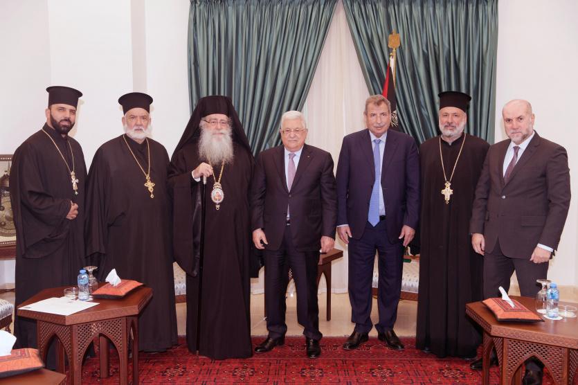 جاء ذلك خلال استقبال الرئيس، ظهر اليوم الثلاثاء، بمقر الرئاسة، المتروبوليت فنيذكتوس الوكيل البطريركي في بيت لحم، والايكونومس سبيريدون سمور، والايكونومس عيسى مصلح، والايكونومس عيسى ثلجية، بحضور رئيس اللجنة العليا لشؤون الكنائس د.رمزي خوري، وقاضي قضاة فلسطين، مستشار الرئيس للشؤون الدينية والعلاقات الإسلامية محمود الهباش.