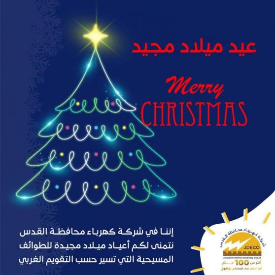 وجهت شركة كهرباء محافظة القدس التهاني للشعب الفلسطيني عامة، وللطوائف المسيحية التي تسير وفق التقويم الغربي خاصة لمناسبة أعياد الميلاد المجيدة، والتي تصادف اليوم الـ24 من شهر ديسبمر.