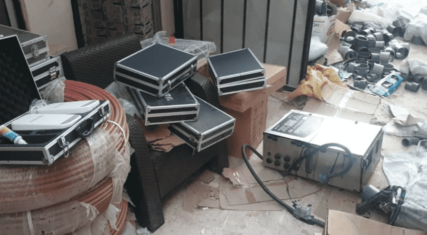وعقب ذلك، جرى التنسيق مع الجهات المعنية من التفتيش داخل العمارة السكنية، فتبين لهم وجود شقق ومستودع وبها كميات كبيرة من المواد الصناعية، بالإضافة لآلات طباعة الماركات التجارية وكميات من العلامات والملصقات وقطعة لمواد صناعية متفرقة مزورة.