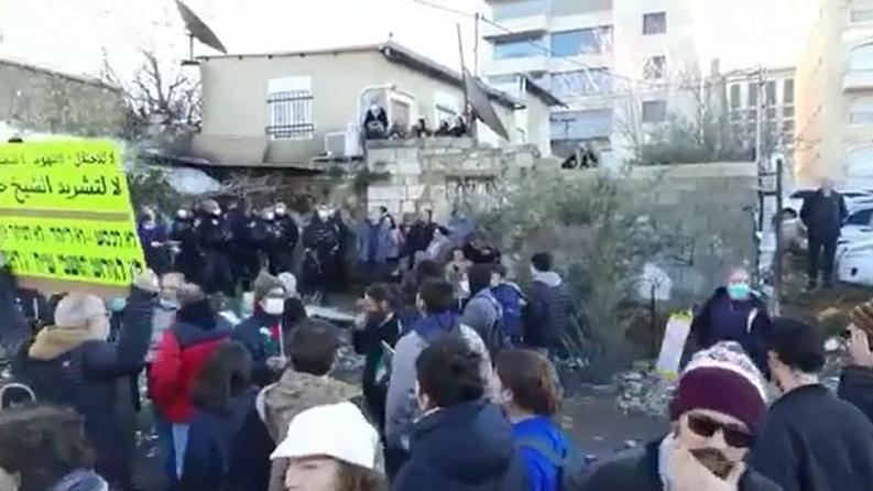 ورفع المشاركون في التظاهرة صورًا لركام منزل عائلة محمود صالحية. كما حاولوا إزالة الأسلاك الشائكة التي وضعها المستوطنون برفقة عناصر شرطة الاحتلال، صباح اليوم، في أرض عائلة الحاجة المقدسية فاطمة سالم.