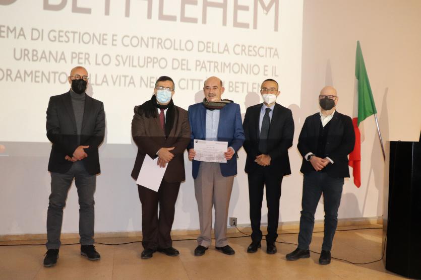 وكان ذلك في حفل أُقيم يوم الثلاثاء الموافق ١/ ٢/ ٢٠٢٢ في مركز السلام بحضور رئيس بلدية بيت لحم المحامي أنطون سلمان، والقنصل الإيطالي العام في القدس جوزييه فيديليه، ومديرة مديرية الحكم المحلي أروى أبو الهيجاء، وممثل المشروع الإيطالي للتعاون الإنمائي السيد داريو بياتيلي، ومنسق مشروع بيت لحم ثلاثية الأبعاد وممثل عن جامعة بافيا السيد ساندرو بارينيلو، ومدير عام البلدية السيد أنطون مرقص، ومدير التخطيط والمشاريع في بلدية بيت لحم م. زياد السايح، وعدد من ممثلي مؤسسات بيت لحم. بينما شارك عبر الزووم رئيس بلدية بافيا السيد فابريزيو فراكاسي، وممثلاً عن مؤسسة السيستير السيد جيان باتيستا باريجي.