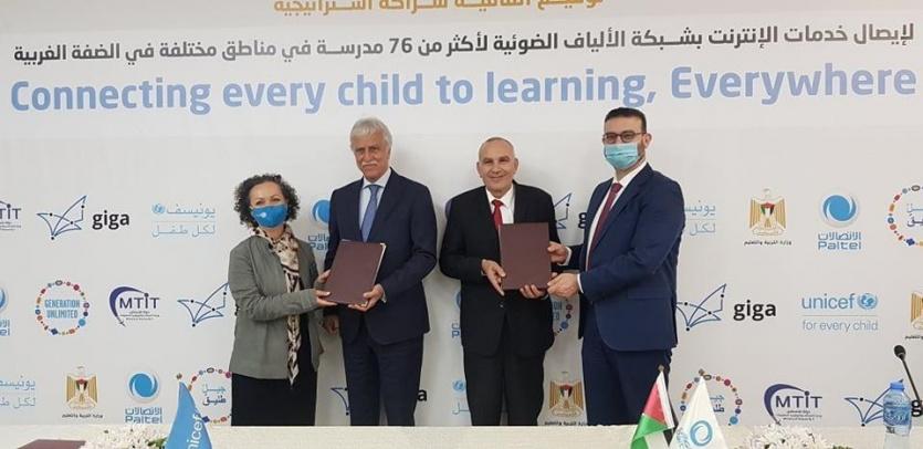 وقعت وزارتا التربية والتعليم والاتصالات وتكنولوجيا المعلومات وشركة الاتصالات الفلسطينية (بالتل) ومنظمة الأمم المتحدة للطفولة (يونيسف)، اليوم الخميس، اتفاقية شراكة لربط 76 مدرسة في الضفة الغربية بشبكة الانترنت، لتمكين ما يقرب من 10,000 طالب وطالبة و1,000 معلم ومعلمة من الوصول إلى مصادر التعليم عبر الشبكة العنكبوتية.