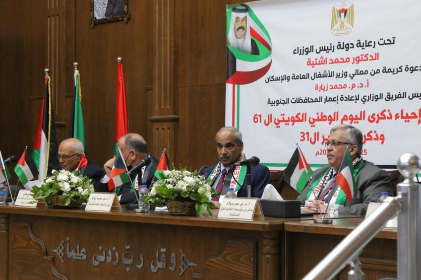 نظّمت وزارة الأشغال العامة والإسكان، اليوم السبت، احتفالًا في مدينة غزة لمناسبة ذكرى اليوم الوطني الكويتي الـ61، وذكرى التحرير الـ31، برعاية رئيس الوزراء محمد اشتية.