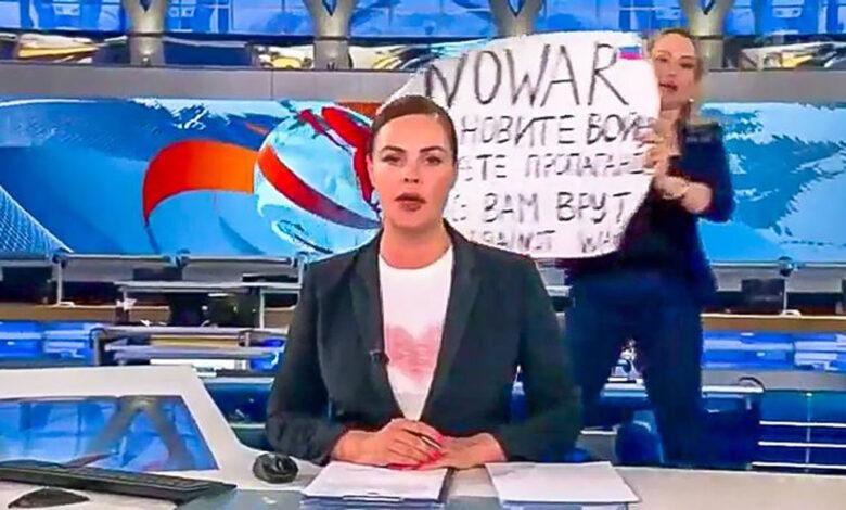 اقتحمت موظفة في القناة الأولى الروسية استديو الأخبار، خلال بث النشرة المسائية التي تعد الأكثر مشاهدة في روسيا، لترفع لافتة خلف المذيعة تندد بالحرب في أوكرانيا.