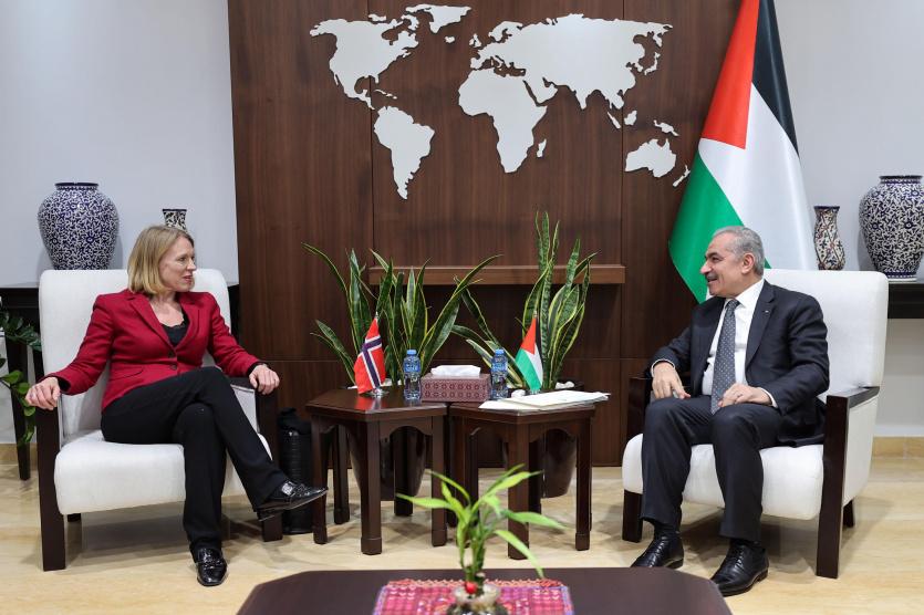 جاء ذلك خلال استقبال اشتية، وزيرة خارجية النرويج أنيكين هويتفيلدت، اليوم الأربعاء، في مكتبه برام الله، بحضور المبعوث النرويجي الخاص لعملية السلام جون هينسين، وممثلة النرويج لدى فلسطين تورن فيستي، ووكيل وزارة الخارجية والمغتربين أمل جادو.