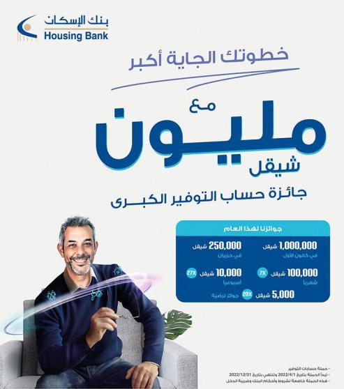 انطلاقا من سياسة البنك الهادفة لتعزيز ثقافة الادخار لدى عملائه ومكافأتهم على ولائهم وثقتهم، أطلق بنك الإسكان حملته الترويجية الخاصة بحسابات التوفير للعام 2022 تحت شعار "خطوتك الجاية أكير" وتبلغ قيمة الجائزة الكبرى مليون شيقل تقدم في نهاية العام، وذلك سعيا من البنك لتشجيع المواطن الفلسطيني بشكل عام وعملاء البنك بشكل خاص على التوفير والادخار، ومن جانب آخر منح المدخرين لدى البنك من كافة القطاعات وجميع الأعمار فرصاً كبيرة للفوز بجوائز عديدة وبقيم كبيرة.