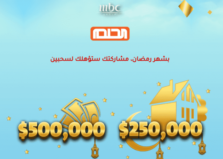 ويمكن النقر في الأسفل للوصول إلى رابط اشتراك مسابقة الحلم لعام 2022، حيث تفتح لك نافذة زرقاء وعليها كلمة (حلم، بشهر رمضان مشاركتك ستؤهلك لسحبين، 250 ألف دولار، 500 ألف دولار).
