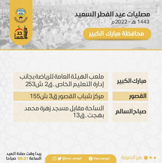 ونشرت وزارة الأوقاف موعد صلاة عيد الفطر 2022 في الكويت العاصمة ومدن الجهراء وحولي ومبارك الكبير والأحمدي، موضحة أنها ستكون في تمام الساعة 05:21 صباح أول أيام العيد.