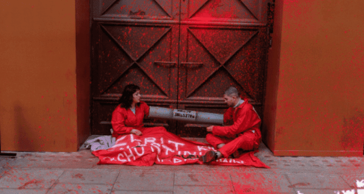 وقام نشطاء من حركة العمل الفلسطيني بتقييد أنفسهم أمام مدخل المبنى الواقع في (77 شارع كينجزواي)، ودهنوا الباب بصبغة حمراء تمثل دماء الفلسطينيين، الذين قتلوا على يد الجيش الإسرائيلي.