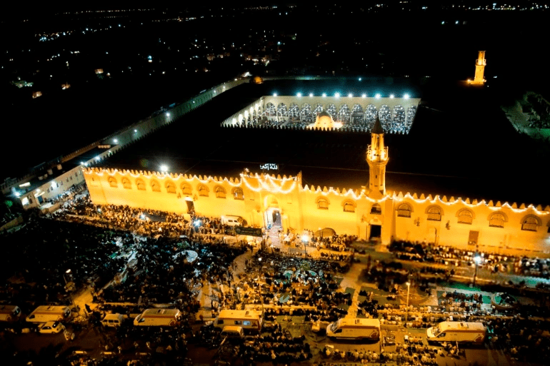 في الساحة الفسيحة يفترش عدد قليل من الأسر الأرض انتظاراً لحلول وقت المغرب ليبدؤون في تناول طعام الإفطار، محاطين بسياج يحجب رؤية الساحة، لم يكن الأمر كذلك قبل عدة سنوات، حينما كان المسجد وساحته يعجان في شهر رمضان بعشرات الآلاف من المصلين من أنحاء القاهرة والأقاليم، الذين يبكرون بالمجيء لحجز مكان في مسجد يزدحم بالمصلين خلال ليال رمضان للصلاة وراء مشاهير القراء وعلى رأسهم الشيخ محمد جبريل.