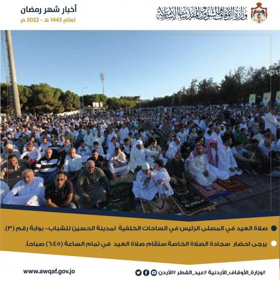 وقالت الأوقاف الأردنية في بيان صحفي عبر فيسبوك : "صلاة العيد في المصلى الرئيس في الساحات الخلفية لمدينة الحسين للشباب - بوابة رقم 3".