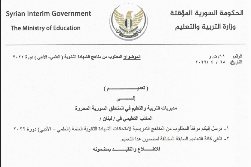 وأرسلت وزارة التربية والتعليم تعميما إلى المديريات في محافظات سوريا والمكتب التعليمي في لبنان يتضمن المطلوب والمحذوف من مناهج الثانوية العامة للعلمي والأدبي دورة العام 2022.