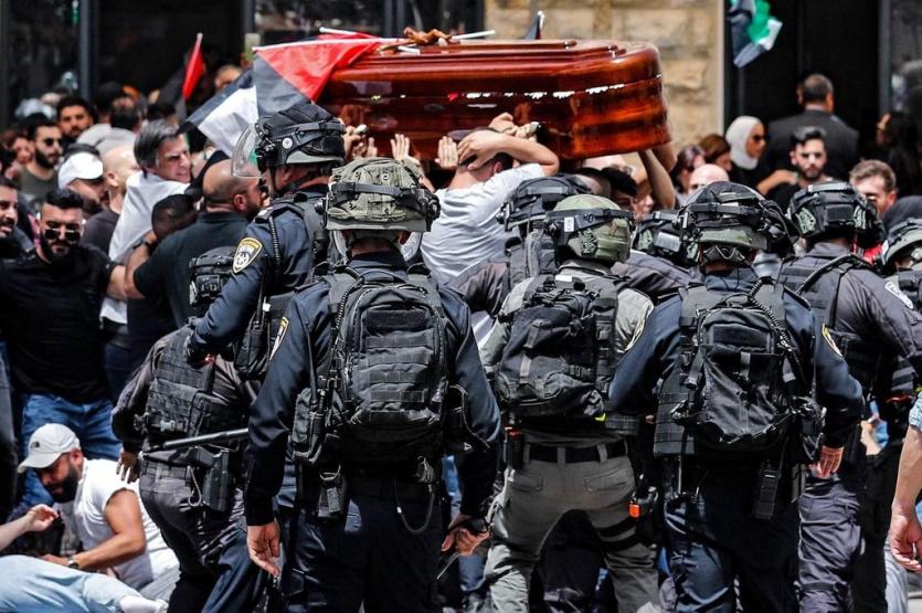 ودفعت شرطة الاحتلال بتعزيزات عسكرية وفرق الخيالة إلى المستشفى الفرنسي، وأغلقت الطرق المؤدية إليه، حيث يسجى جثمان الزميلة أبو عاقلة، وصادرت الأعلام الفلسطينية التي رفعها المشيعون في الموكب، ومنعت المئات منهم من مغادرة المستشفى واللحاق بموكب التشييع