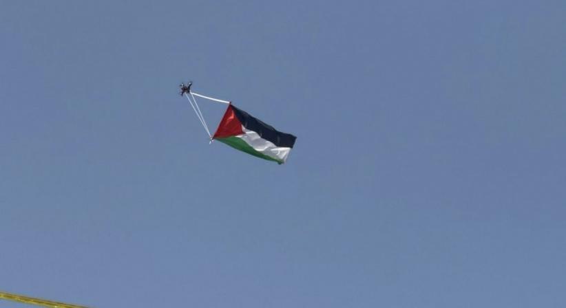 ورفع العلم عبر طائرة صغيرة بدون طيار وتم تسييرها عن بعد، حيث حلقت لدقائق قصيرة قبل أن تختفي فيما يبدو لأسباب تتعلق بملاحقة القوات الإسرائيلية للشبان الذين نجحوا في تسييرها.