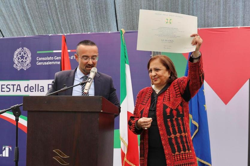 وقلد القنصل الإيطالي العام السيد جوسيبي فيدلي وزيرة الصحة الوسام، تقديراً لجهودها الكبيرة في تعزيز العلاقات الايطالية الفلسطينية خلال عملها كسفيرة سابقة لدولة فلسطين لدى الجمهورية الإيطالية، ونجاحها في إدارة جائحة كورونا كوزيرة للصحة، رغم الظروف الصعبة.