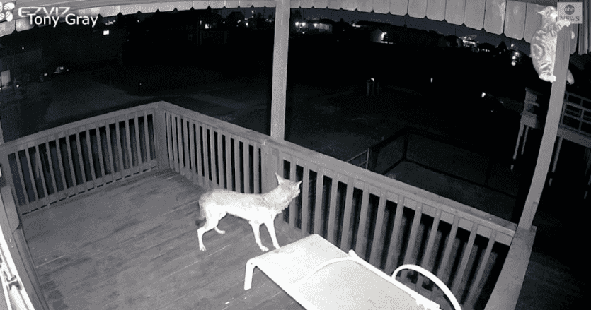 وفي الفيديو، هاجم ذئب "كويوتي" قطة على شرفة منزل، ولكن القطة دافعت عن نفسها باستبسال، وحاولت القفز على وجه الذئب لإضعافه، حتى لو للحظات.